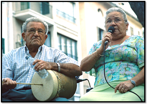 Jaume “Blanco” i Catalina “Blanca”, en un acte de l’Escola de Cant amb Ximbomba de Sarau Alcudienc fa una quinzena d’anys. Arxiu Sarau Alcudienc-Bibiloni.